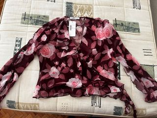 Bonita blusa con estampado floral. - Diseño con escote Bardot. - Cintura elástica fruncida. - Mangas largas con volantes en los puños. Es muy favorecedora, la vendo porque ahora mismo me queda pequeña pero está puesto en 2 ocasiones.