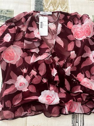 Blusa corta con estampado floral y detalle fruncido en la parte delantera. Mangas abullonadas con volantes. - Diseño con escote en V. - Cierre de cordón en el centro. - Bajo con volantes. Usada solo 2 ocasiones.