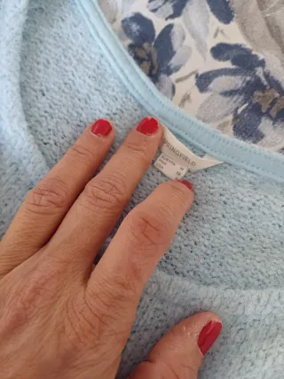 Blusa celeste con un diseño de volantes en los hombros. Es una prenda suave y cómoda. - Tejido de tacto agradable. - Mangas largas. - Cuello redondo.