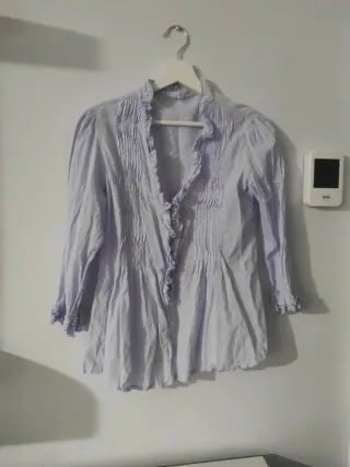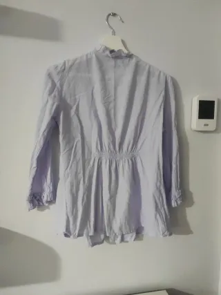Blusa de manga larga en tono lila claro, con un diseño delicado. - Pequeños volantes en el cuello y puños. - Detalle de fruncido en la parte delantera. - Cierre de botones.