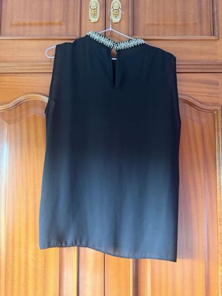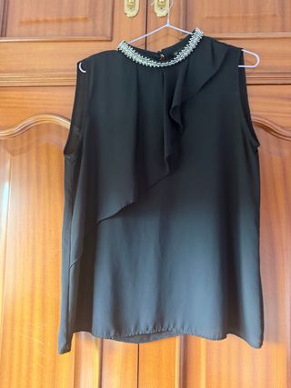 Elegante blusa negra sin mangas, con un detalle de pedrería en el cuello sin estrenar - Cuello alto adornado con pedrería. - Diseño con volantes. - Tejido ligero.