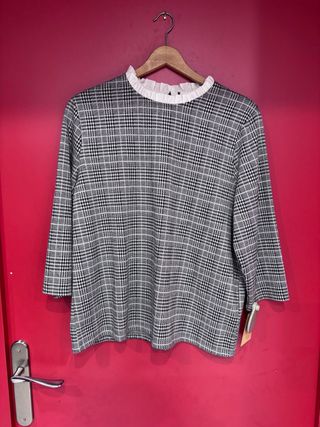 Elegante blusa con estampado de cuadros. - Diseño con cuello volante. - Manga 3/4. - Tejido cómodo.