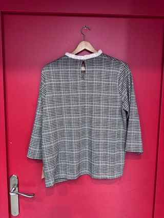 Blusa con un diseño de cuadros y detalles de volantes en crespón. Medidas: largo 56 cm, manga 59 cm, hombros 36 cm y sisa 92 cm Hecha en modista. Perfecta. ÚNICA propietaria. MÁS COSAS EN MI PERFIL.