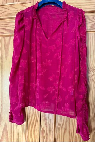 Elegante blusa de gasa con un bonito detalle de volantes en el cuello y puños abotonados. - Tejido ligero y vaporoso. - Cierre de botones en la parte delantera. - Mangas largas abullonadas. -Talla M
