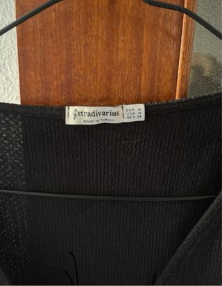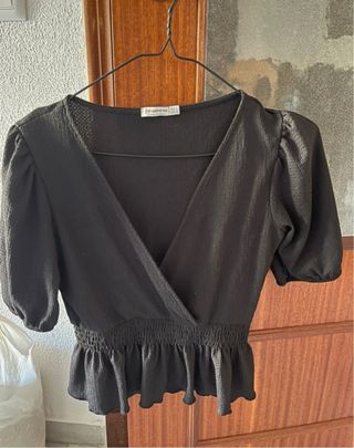 Blusa negra de Stradivarius con un diseño elegante y moderno. - Escote cruzado en pico. - Manga abullonada. - Cintura elástica fruncida. - Bajo con volante.