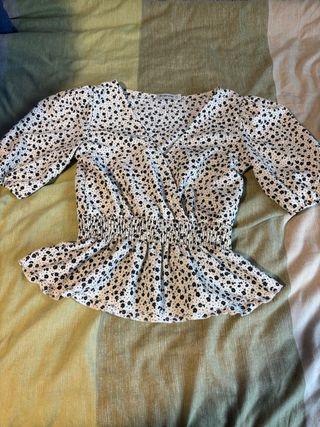 Blusa con motivo floral y media manga. Tiene un volante interno que hace que la parte de atrás sea un poquito más larga perfecta para tapar los glúteos. Es una L pero puede dar un poco más de talla ya que viene grande.