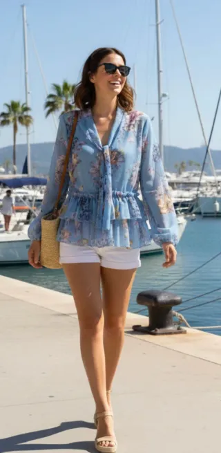 Elegante blusa con estampado floral en tonos azules y rosados. Su diseño con volantes le da un toque coqueto y femenino. - Manga larga. - Cuello con lazada. - Volantes en cascada en el bajo.