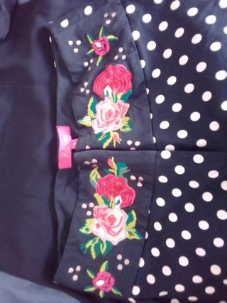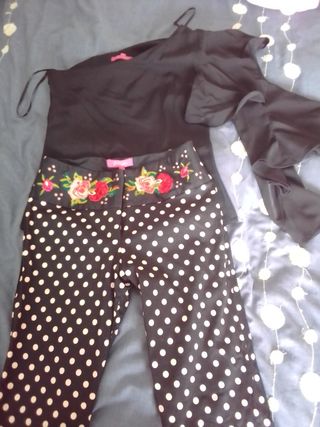 Conjunto pantalón y blusa.La cintura del pantalón va bordada y la blusa es de un brazo y lleva volante.Solo lo he usado en una ocasión.