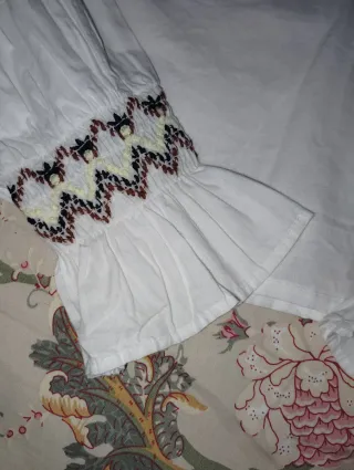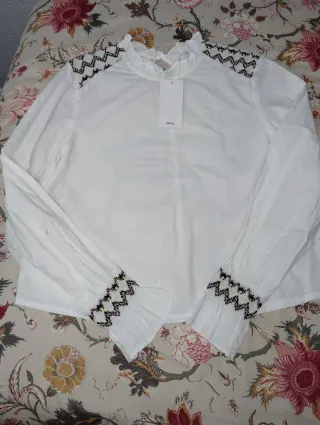 Blusa blanca de Mango con detalles bordados. Sin estrenar con etiqueta - Cuello con volantes. - Mangas largas con puños bordados y volantes. - Bordado en zigzag negro, amarillo y blanco en hombros y puños.