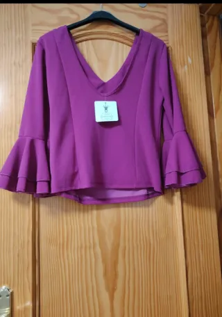 Elegante blusa morada con un diseño moderno. - Escote en V. - Mangas acampanadas con doble volante. - Corte favorecedor.