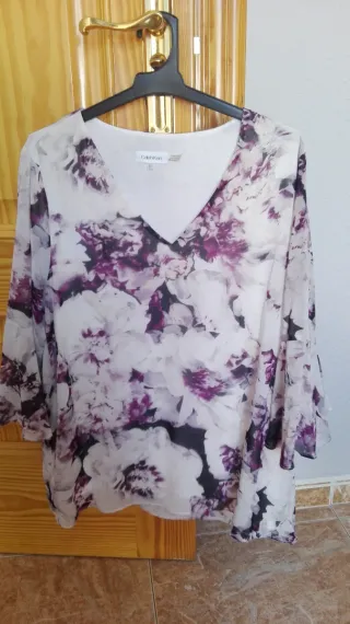 Preciosa blusa de la marca CalvinKlein. Es una prenda elegante y vistosa de gasa - Diseño floral en tonos morados y blancos. - Manga 3/4 con volante - Cuello en pico. Talla xL sirve también para L. Como nueva. Costó 90€. REBAJADA!!!!