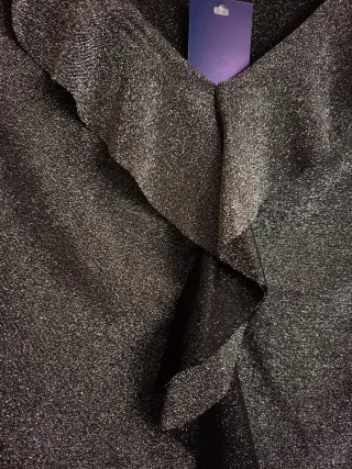 Preciosa blusa negra de estilo elegante. - Escote en pico. - Volantes en los hombros con detalles de perlas. - Tejido ligero y fluido. - Perfecta para ocasiones especiales o para el día a día.