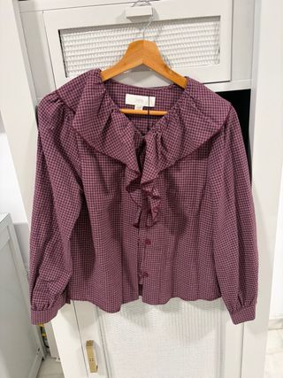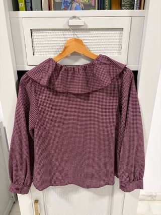 Blusa de manga larga con un diseño de cuadros. - Cuello alto. - Volantes en el cuello y puños. - Cierre de botones.