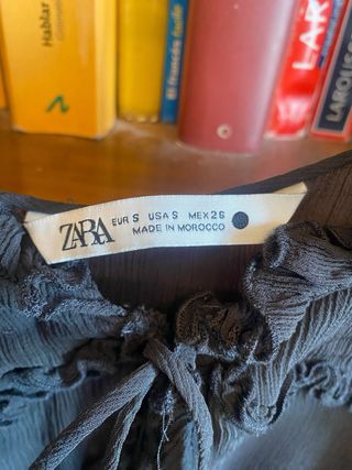 Elegante blusa de Zara con un diseño único. - Tejido ligero y vaporoso. - Estampado sutil de detalles dorados. - Cuello con volantes y cierre de botones. - Mangas largas abullonadas.