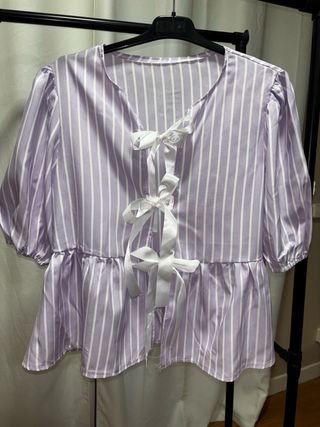 Blusa con un diseño de rayas verticales. Tiene un escote en V con lazos. - Mangas abullonadas. - Volante en la parte inferior.