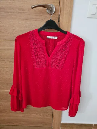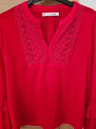 Blusa de color rojo con un diseño moderno y favorecedor. - Tejido ligero y con textura. - Mangas con volantes. - Detalle de cordón ajustable en la parte superior.