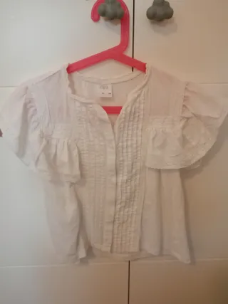 Bonita blusa de manga corta con detalles de encaje y puntillas. - Cuello redondo con acabado festoneado. - Abertura frontal con botones. - Mangas abullonadas con volante. - Adornos de puntilla en mangas y pechera. - blusa blanca 5€ -blusa verde 5€ -blusa beige 2€ -blusa de punto tirantes 3€
