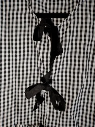 Camisa de mujer con estampado de cuadros. - Diseño con lazada frontal. - Mangas largas abullonadas. - Volante en el bajo.