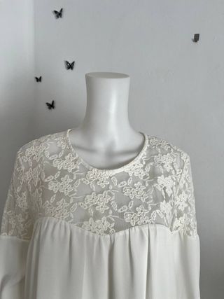 Preciosa blusa blanca de la marca Sfera Basic, Es de plumeti y tiene detalles de encaje. - Tiene un diseño delicado y elegante. - Perfecta para cualquier ocasión.