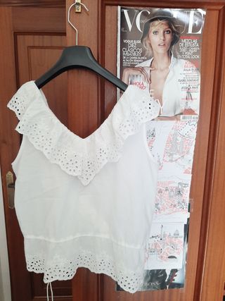 Preciosa blusa sin mangas de la marca Cortefiel, talla M. Es de color blanco roto y tiene un diseño elegante y sencillo. - Cuello en pico. - Detalle de encaje dorado en el escote. - Tejido ligero y fluido. - Da más talla, para L - largo 65cm, de sisas 52cm