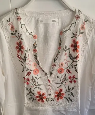 Blusa de algodón con un diseño floral bordado y detalles de lentejuelas. - Mangas largas con bordados. - Cuello en V con abertura. - Adornos de encaje en el pecho y puños. #camisa #blusa #tshirt #blusabeige #zara #zaramujer #blusasmangaslargasmujer #camisamujer #tallaM #rosa #multicolor #camisablanca #naranja #sfera #sferamujer #ropacasual #bordados #floreado #floral #mangaslargas #escotev #blusadealgodón