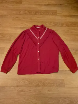 Hago descuento por lotes. Elegante blusa de manga larga en color granate. Presenta un detalle de encaje en el cuello y los hombros, aportando un toque sofisticado. - Cuello redondo con detalle de encaje. - Mangas largas abullonadas. - Cierre de botones en la parte delantera.