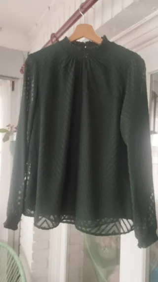 Bonito blusón de manga larga con un diseño elegante. Talla XL justa...el verde es precioso aunque en las fotos no se aprecia - Tejido con textura y detalles de encaje. - Cuello alto con fruncido. - Puños y bajo con detalle de encaje.