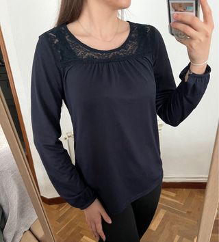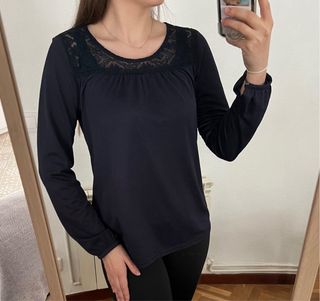 Blusa de manga larga, de color azul marino, talla M de Kiabi, la parte superior es de encaje. En buen estado. Medidas: de hombro: 40 cm; de sisa: 52 cm; de largo: 65 cm
