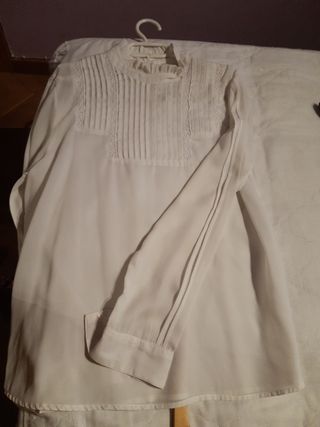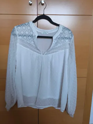 Preciosa blusa blanca de la marca Sfera, talla M. Es de manga larga y tiene un diseño elegante y delicado. - Cuello camisero. - Detalle de encaje en el cuello y hombros. - Ajuste en la cintura.
