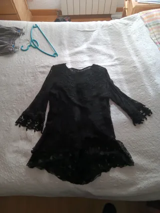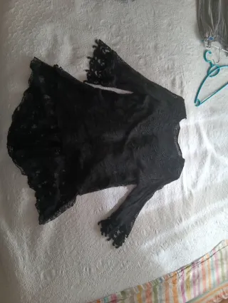 Elegante blusa de encaje con manga pagoda . Tejido elástico. Talla única que equivale a talla M/L. Medidas: - de sisa a sisa:53 cm - largo : 56 cm En perfecto estado.