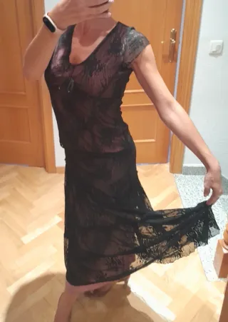 Elegante conjunto de blusa y falda larga con detalles de encaje. - Diseño en color negro. - Blusa con escote en V y manga corta. - Falda con varias capas de encaje. - Cierre con lazo en la blusa. Forro moradito que la hace aún más bonita. La falda tiene abajo un poco rajado el encaje, lo enseño en fotos por eso el precio. Blusa largo, 0,58cm De sisa a sisa, 0.44cm Falda largo, 0.75cm Cintura 0.34cm pero es elástica. Es talla 42 pero perfecto para talla M