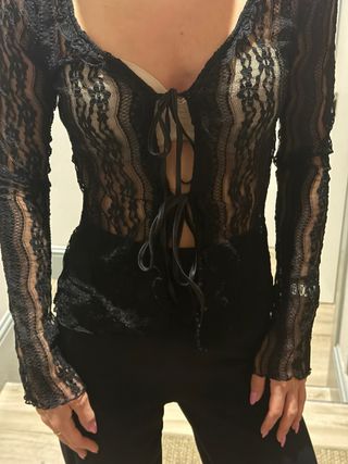 Elegante blusa de encaje con un diseño transparente. Mangas acampanadas - Manga larga acampanada. - Acabado con detalles de encaje en el borde. - Tejido ligero y delicado.