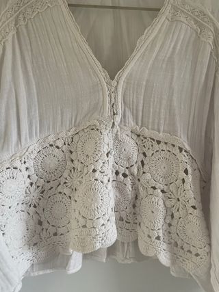 Blusa de Zara con un diseño bordado y detalles de crochet. - Manga larga abullonada. - Escote en V con botones. - Adornos de encaje en cuello y puños. - Parte delantera con panel de crochet circular.