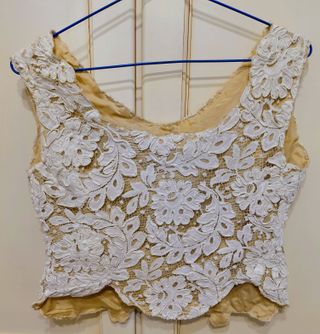 Elegante blusa con un intrincado diseño de gipur floral. Mide 90 de pecho, 80 de cintura, 88 cadera y largo 47. Está hecho a mano - Tejido de encaje blanco sobre base beige. - Diseño sin mangas. - Escote en V pronunciado. - Acabado festoneado en el bajo.