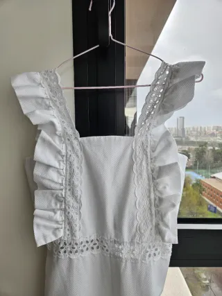Mono sin mangas confeccionado en tejido de piqué blanco con pechera de volantes. Permite llevarlo sin ningún top/blusa/camiseta debajo. Escote cuadrado con tirantes acabados en volantes. La cinturilla la forma una pasamanería de encaje con bordado inglés. Pernera recta y cierre con cremallera trasera invisible.