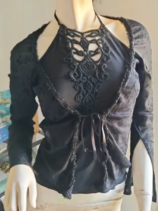 Blusa de encaje con manga larga y volante al final. esta abierta y se anuda con lazo. Regalo Top que esta en las fotos