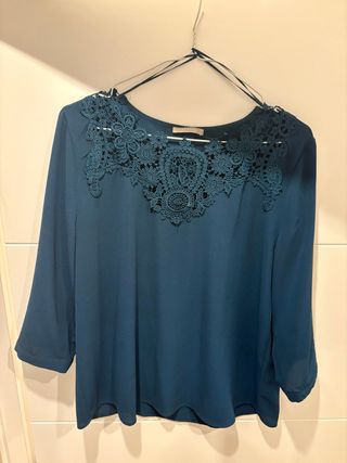 Elegante blusa de manga larga con un delicado bordado en el escote. - Color azul petróleo. - Detalle de encaje en el cuello. - Manga tres cuartos.
