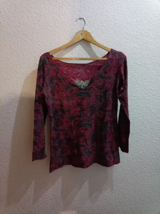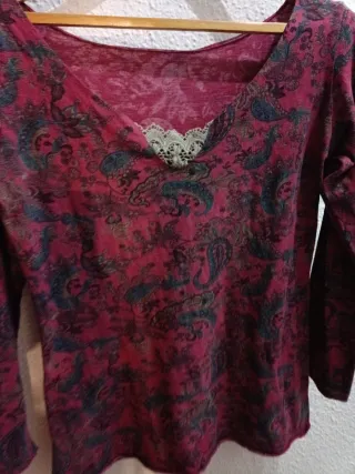 Preciosa blusa de manga larga. Es de color rojo y tiene un bordado bonito en el cuello. - Talla M. - Perfecta para cualquier ocasión.Blusa con encaje en el cuello ,negra con lunares,más larga por detrás ,está más usada que la granate talla 42.,grande.Precio por unidad.