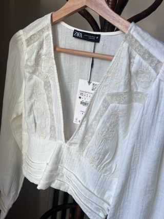 Preciosa blusa de Zara, nueva, en color blanco. Es de manga larga y tiene delicados detalles de encaje. - Talla: (Añadir talla) - Tejido ligero y vaporoso. - Ideal para ocasiones especiales o para el día a día.