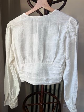 Preciosa blusa de Stradivarius en talla L. Es de color blanco y tiene manga larga. La blusa tiene un diseño bonito y elegante. - Cierre de botones. - Detalle de encaje en el escote. - Corte cropped.