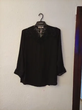Elegante blusa negra con detalles de encaje. - Cuello en V con detalle de encaje. - Mangas largas con puños de encaje. - Tejido ligero y fluido. - es de talla XXL pero va a L. - es muy elegante.