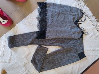 Elegante conjunto de la marca Rinascimento, talla M. Está compuesto por una blusa y leggings a juego. La blusa tiene un detalle de encaje negro en el escote. Las prendas presentan un diseño en espiga en tonos grises y negros. Se encuentra en buen estado. - Talla: M y L- Diseño en espiga - Incluye blusa y leggings