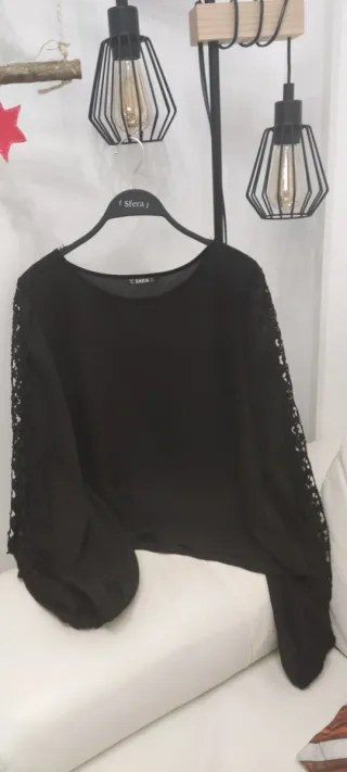 Elegante blusa negra con detalles de encaje en las mangas. - Diseño con mangas largas y voluminosas. - Tejido ligero y vaporoso. - Acabado con encaje en los puños y hombros.