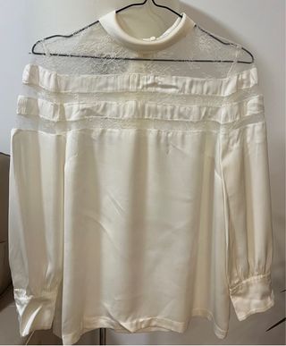 Elegante blusa blanca de Zara con detalles de encaje. - Diseño con cuello redondo. - Mangas largas. - Panel de encaje en la parte superior delantera y en las mangas. Color crema.