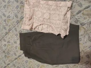 Conjunto de dos prendas: una blusa de punto con detalles de encaje y un pantalón. - Blusa de color beige con diseño de encaje. - Pantalón de color verde oliva.