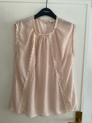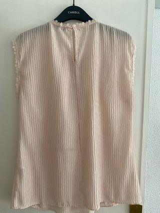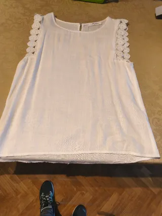 Blusa de gasa con un detalle de encaje en la parte central de la espalda. Es una prenda ligera y fluida. - Diseño sin mangas. - Encaje blanco en el centro. Recogida.Barrio del pilar 28029