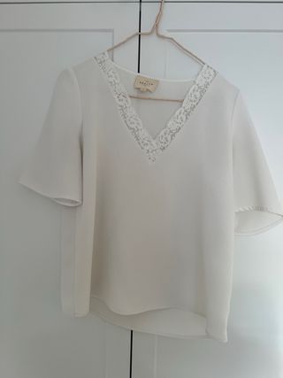 Elegante blusa blanca con delicado encaje floral. - Diseño con escote en V. - Manga corta. - Detalle de pequeñas perlas en el escote. - Tejido ligero y transparente.
