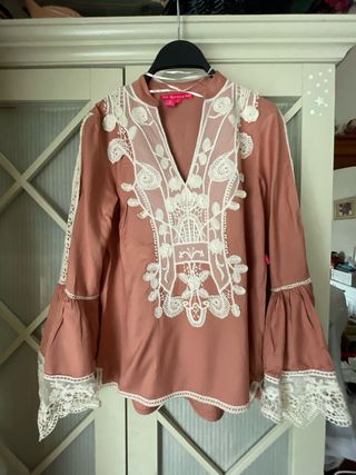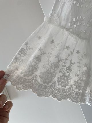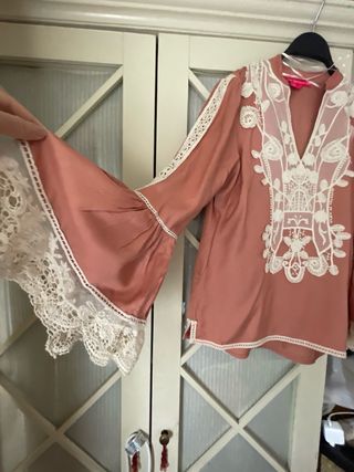 Prenda de marca italiana (Mihos Italy) con acabados de alta calidad, ideal para un look ibicenco, eventos de verano o para ir a la playa con estilo. • Detalles de diseño: Combinación de bordado suizo (broderie anglaise) y paneles de encaje floral delicado. • Corte: Diseño en niveles con mucho movimiento y mangas acampanadas muy favorecedoras. • Escote: Escote en V trabajado con detalles de encaje. • Estado: En perfecto estado, muy poco uso. • Talla: L/M • Tejido: Muy fresco y ligero, perfecto para el calor. Prenda versátil que queda genial tanto con vaqueros como con shorts o bikini