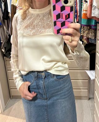 Elegante blusa de satén con detalles de encaje. Una pieza versátil y sofisticada. - Tejido de satén brillante. - Delicado encaje en el escote y bajo. - Cierre de botones. - Cuello con lazada.