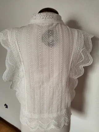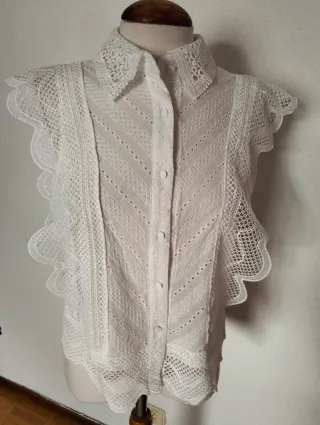 Elegante blusa de la marca Reserved con un delicado detalle de encaje en el cuello. Tejido ligero y vaporoso. Mucho estilo. Muy buena calidad de la tela y excelente estado.